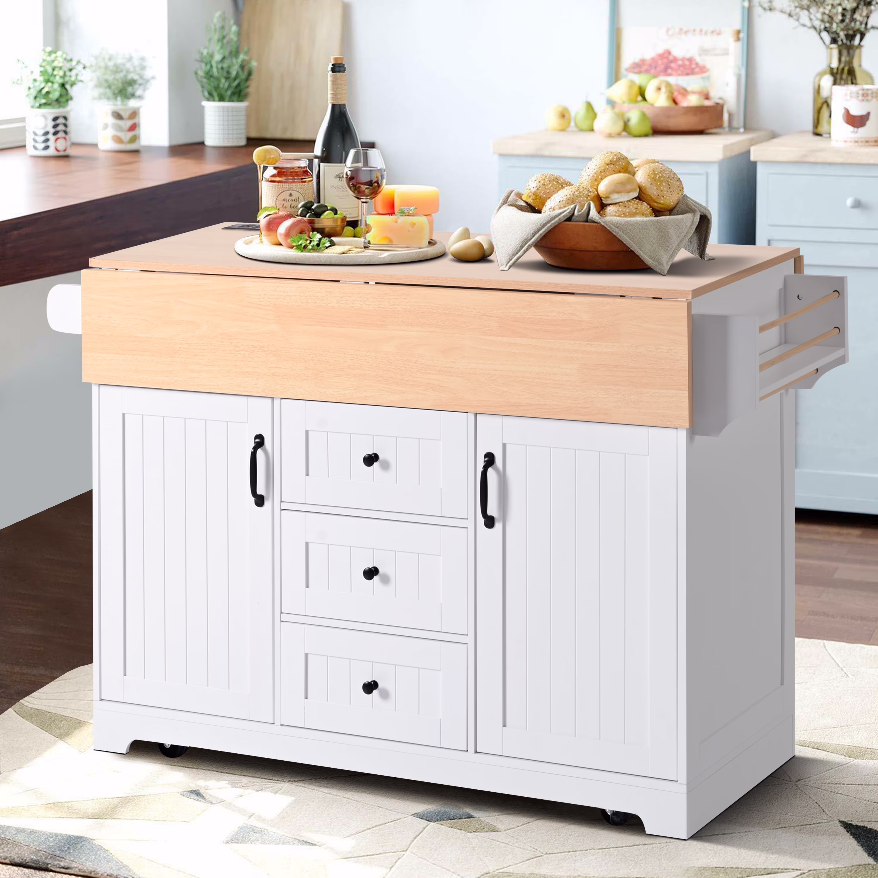 Glavbiku 55.7" Kitchen Island Cart on Wheel with 2 Drop Leaf,Power Outlet,3 Drawer for Kitchen White