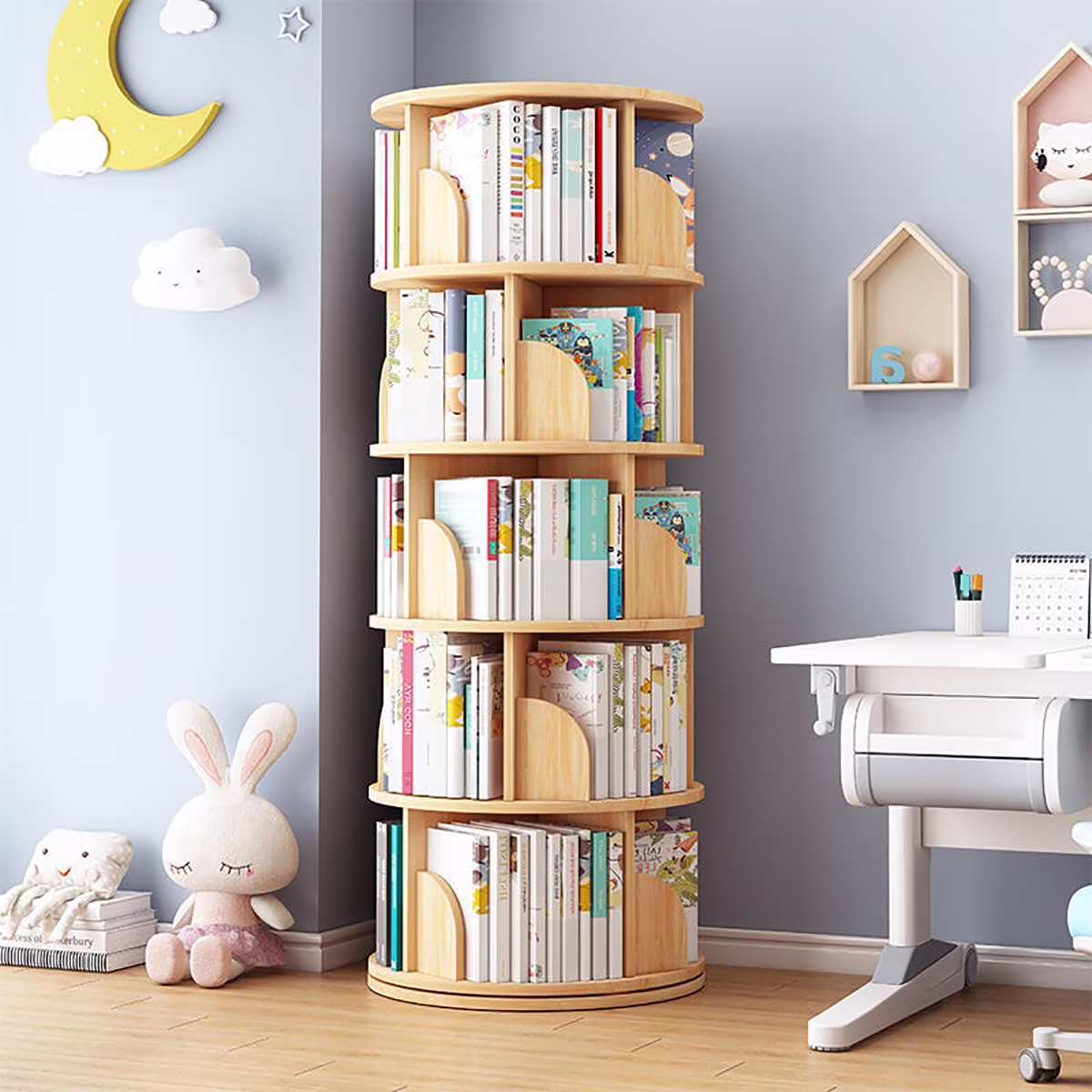 Rotating Bookshelf Tower, 4/5 Tier Circular Bookcase for Kids&Adults, Wood 360�� Floor Standing Book Storage Rack, Spinning Bookshelfs Tower for Classroom Playroom Study Bedroom