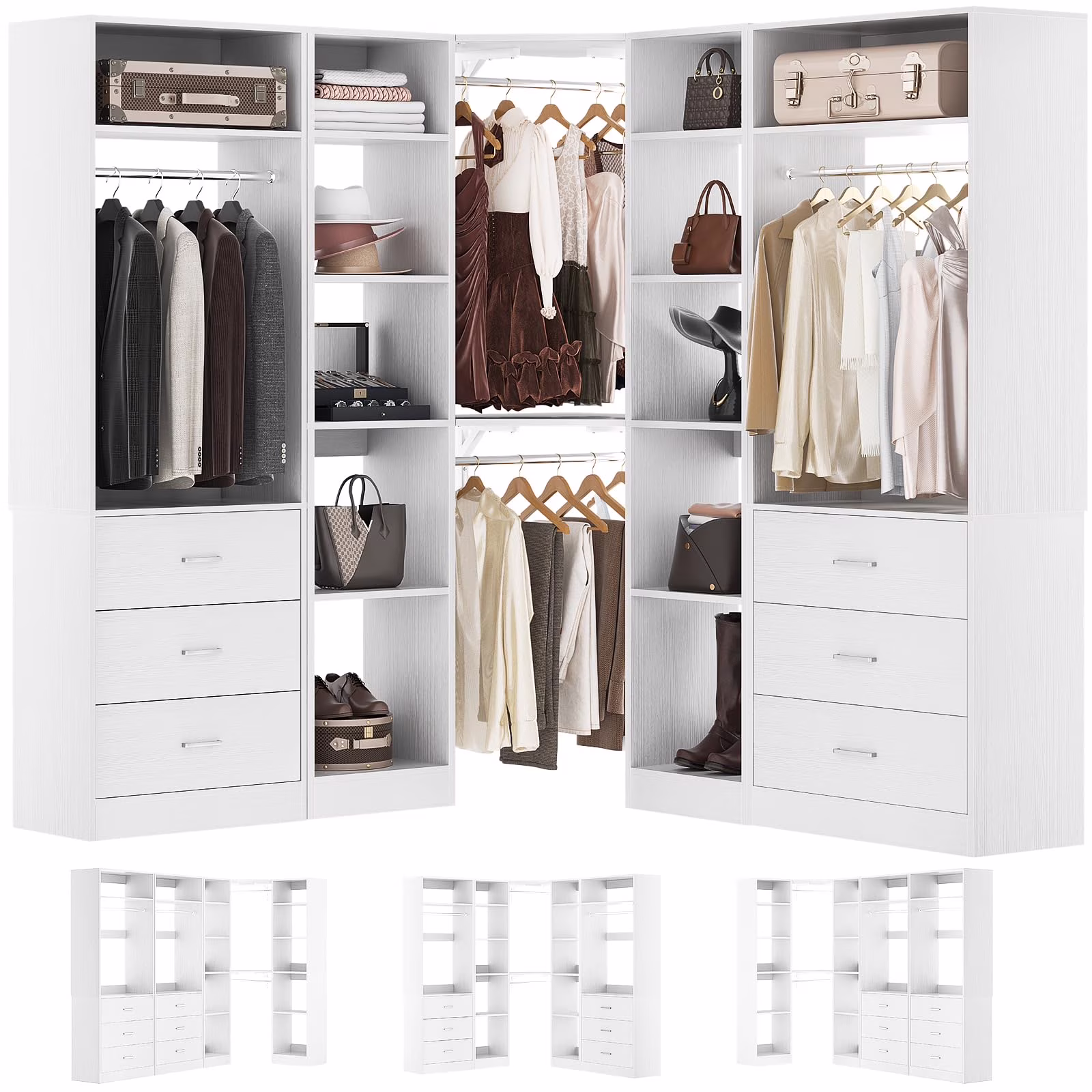 Homieasy 87.2" Freestanding Closet Organizer System - Modular L-Shaped Design,Reversible, 6 Drawers & 4 Hanging Rods, 2000+ LBS Capacity,3 Sets,White